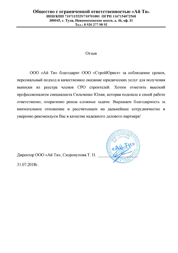 Отзывы клиентов "СтройЮрист" по вступлению в СРО в Петропавловске-Камчатском